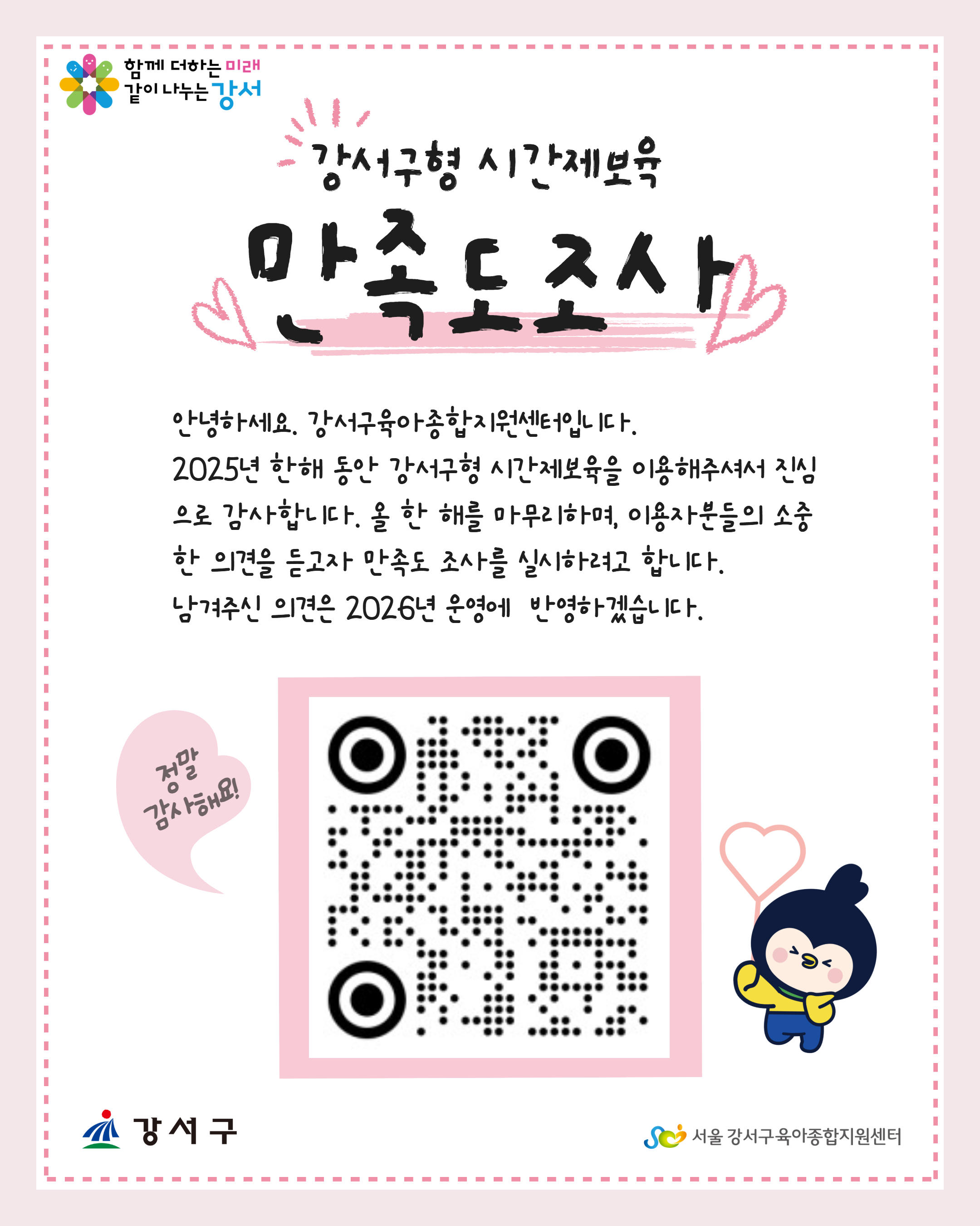 2025년 한해를 마무리하며 강서구형 시간제보육 만족도 조사를 실시합니다.