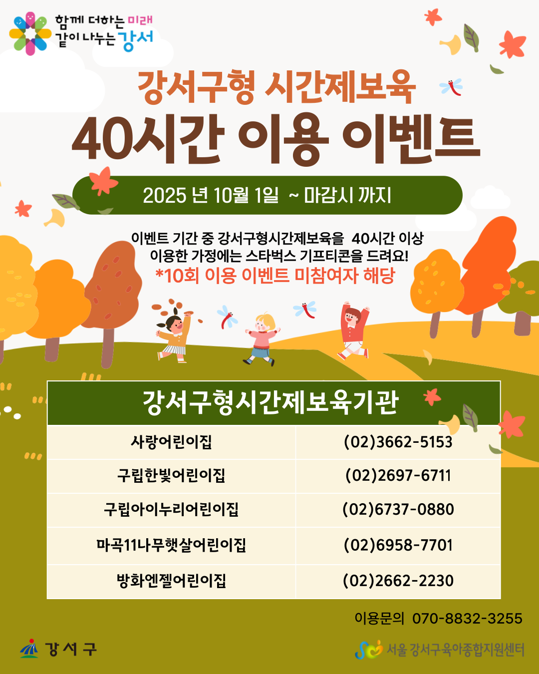 기간 : 2025년 10월 ~ 마감시 까지 대상 : 강서구형 시간제보육을 40시간 이상 이용한 학부모 상품 : 스타벅스 아메리카노 기프티콘신청 : https://forms.gle/FwWFJ9uZJDAu6aZF7